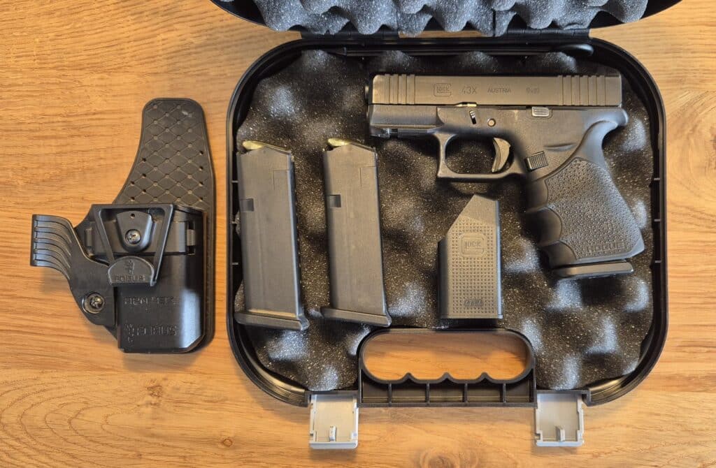 גלוק 43X תוצרת אוסטריה, עם מסילה לפנס או ציין. האקדח נשמר בקנאות ובמצב מעולה. האקדח מגיע עם: גריפ של חברת הוג, 3 מחסניות מקוריות של 10 כדורים, דוחס כדורים עבור המחסניות, קייס מקורי של האקדח, נרתיק של חברת Fobus.