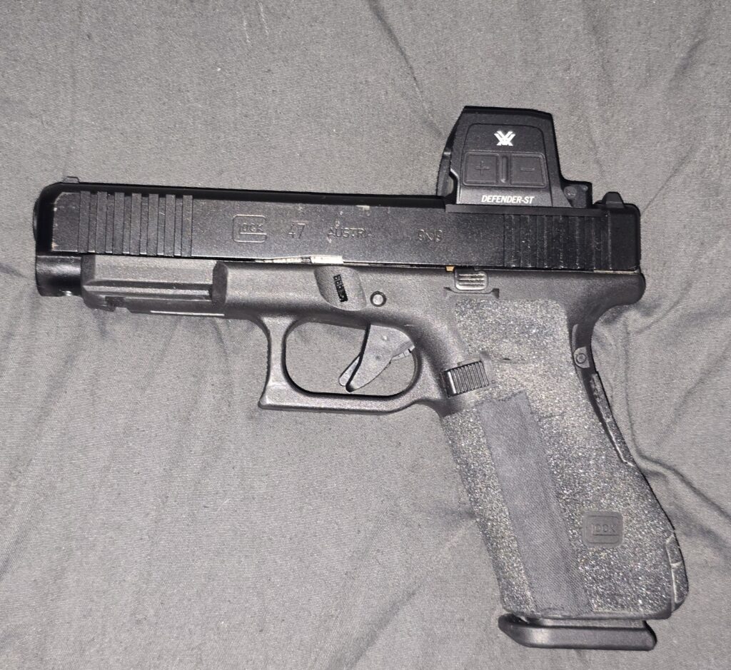 אקדח מטופל ושמור היטב , 4 מחסניות של 17 כדורים , פתח מחסנית מורחב, עצר מחלק משודרג , כוונות ברזל זוהרות , הכנה לאופטיקה (*נמכר ללא) , מגיע עם : נרתיק קיידקס פנימי של Frontline , פונדת פאדל קשיחה לשתי מחסניות. מופקד בתל-אביב.