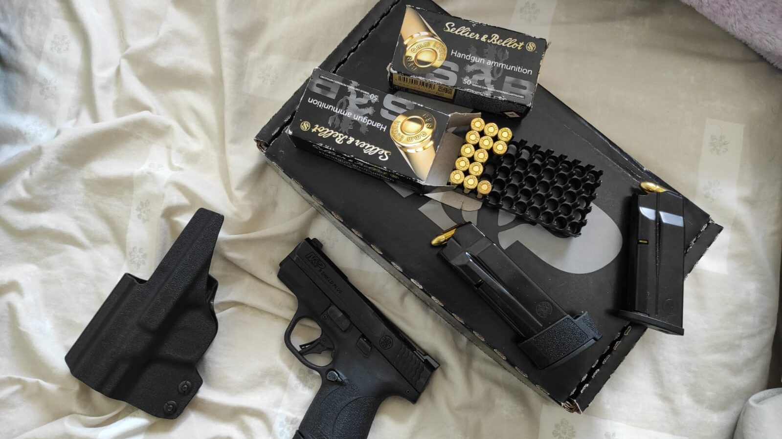 אקדח S&W SHIELD PLUS כחדש ממש. נרכש לפני פחות משנה. לא ירה כדור מימיו. נמכר בעקבות שינוי תבחין (מעבר לעיר ללא זכאות לרישיון). מגיע עם 3 מחסניות (10,13,15) שכמובן משפיעות על גודלו ונוחות ההחזקה שלו. למעט נשיאתו עליי כמה פעמים, לרוב היה נעול בכספת. המחיר כולל 100 כדורים.